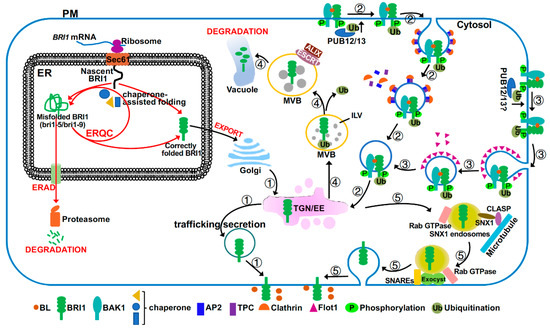 The BR signaling activity at the PM is also controlled by the amount of the PM-localized BRI1 receptor, which starts its secretory journey in the endoplasmic reticulum (ER) (Figure 3). It was well known that the ER houses several stringent quality control (QC) systems that permit export of only correctly folded proteins into the Golgi apparatus but retain incompletely or incorrectly folded proteins in the ER for chaperone-assisted folding repair or degradation via ER-associated degradation mechanism (ERAD) [78,79]. Two structurally defect but biochemically competent mutant variants of BRI1, bri1-5 with Cys69-Tyr mutation and bri1-9 carrying a Ser662-Phe mutation, are retained in the ER and degraded by ERAD [80,81,82] (Figure 3). Loss-of-function mutations in the ER quality control (ERQC) or ERAD system resulted in increased amounts of mutant bri1 receptors on the PM, thus partially suppressing the dwarfism phenotype of these bri1 mutants as the corresponding mutant BRI1 proteins still retain partial signaling activity after being correctly targeted to the PM [83,84,85,86]. A recent study also suggested the presence of a yet to be defined QC system at the PM to remove misfolded/damaged PM-localized proteins, such as bri1-301 (with a Gly989-Ile mutation) that escapes from ERQC/ERAD [87,88]. TWD1 (Twisted Dwarf1), a well-studied cochaperone protein that was previously shown to be localized in the ER and at the PM, where it regulates auxin transport [89], also interacts with both BRI1 and BAK1 to enhance BR signaling [90,91]. Given its demonstrated interaction with HSP90 (heat shock protein 90) [92,93], it is tempting to speculate that TWD1 could promote optimal folding of BRI1 and its coreceptor, thus maximizing their BR signaling activities at the PM.