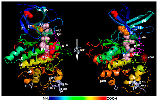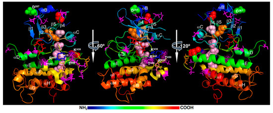 A crystal structure of the BAK1 kinase domain. Shown here are three rotation (0°, 60°, and 180°) views of a rainbow-colored ribbon model of the crystal structure of the BAK1 kinase domain (Protein Data Bank No: 3uim). Individual α-helices (αB-αI) and β-strands (β1-β5) were labelled. The purple sticks indicate phosphorylated Ser/Thr residues with the Thr450 and Thr455 residues surrounded with purple dots. The red sticks show the bound adenylyl-imidodiphosphate (a non-hydrolysable ATP analog), the light-orange sticks denote the two residues that form the conserved salt bridge between the β3-strand and the αC-helix, the blue sticks represent the three positively charged residues that make up the phosphate-binding pocket, and the dark-orange sticks indicate phosphorylated Tyr residues. The pink spheres mark the R-spine residues, the red spheres show the two Cys residues that were S-glutathionylated in vitro, the orange spheres denote the gatekeeper Tyr residue, and the green spheres designate the Asp287 residue important for Ca2+-dependent BAK1 cleavage. The rainbow bar indicates the order of AAs from the N-terminus (blue) to the C-terminus (red).