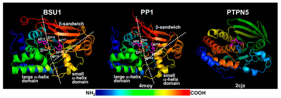 Comparison between a structure model of BSU1’s phosphatase domain with crystal structures of PSP (protein Ser/Thr phosphatase) and PTP (protein tyrosine phosphatase). Shown here are a predicted structure of the BSU1’s C-terminal phosphatase domain [obtained at SWISS-MODEL at https://swissmodel.expasy.org/ using the protein sequence of BSU1 (accession No: NP_171844)], a crystal structure of a human PSP (HsPP1; Protein Data Bank No. 4moy), and a crystal structure of a human PTP (HsPTPN5 for the human PTP non-receptor type 5; Protein Data Bank No. 2cjz). The conserved metal-coordinating amino acid residues are indicated by colored sticks: orange colored Asp(D)510, Asp(D)544, and Asn(N)576, and three magenta-colored His(H) residues. The three dotted white lines separate the β-sandwich of two β-sheets from the two flanking α-helix domains in the structure models of BSU1 and PP1. The dotted spheres and the red sticks in PP1 represent two metal ions and the phosphate, respectively. The two conserved residues (Cys and Arg of the HCX5R catalytic signature motif) are colored with magenta in the human PTPN5 structure and a phosphorylated tyrosine is shown with blue sticks. The rainbow bar indicates the order of AAs from the N-terminus (blue) to the C-terminus (red) of each peptide.