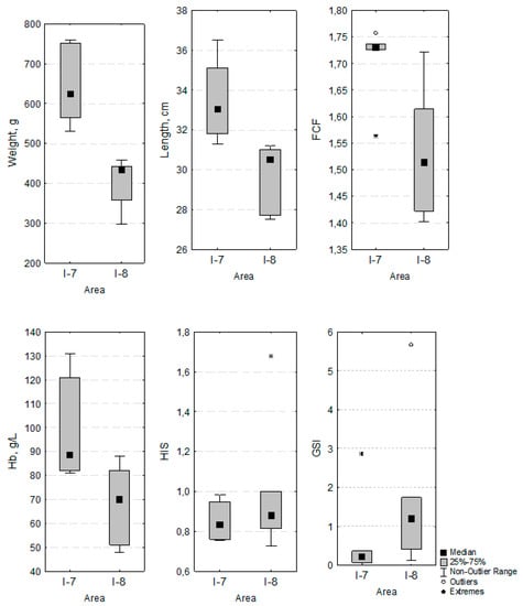 The physiological state of the fish was evaluated by the weight, length, FCF, blood hemoglobin concentration, HIS, and GSI. If the first four parameters were significantly different in fish from the two areas, the last two did not differ (Figure 1). It should be noted that the blood hemoglobin concentrations were in the range of the environmental optimum (80–130 g/L) in whitefish from area I-7, while the blood hemoglobin concentration in more than half of the studied fish from area I-8 was below the normal value. While the GSI did not significantly differ between whitefish from these areas, whitefish from area I-7 were at an earlier stage of maturation, which is quite natural in conditions of warmer water. It is also important to note that one whitefish had the maximum GSI (2.86), with the minimum FCF (1.56), of all whitefish in the thermal affected area, while one whitefish had the maximum GSI (5.67), with the maximum FCF (1.72), of all whitefish from area I-8. Thus, the individual physiological state, pathological deviations, and maturation stage introduced dispersion into the range of the bioaccumulation of metals, metalloids, and trace metals in whitefish organs and tissues, but did not affect the significance of the differences in the average values between the areas.