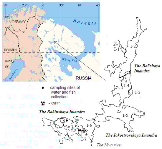 The study was based on data obtained in 2018 on whitefish in the two areas of Lake Imandra (Figure 2). I-7 is the area of influence of warm water discharges from KNPP; and I-8 is the area not experiencing thermal influence, but the most similar in water chemistry. In this study, 12 fish (six from each area of the lake) were examined to determine the metal concentrations in their organs and tissues, as well as their physiological state.