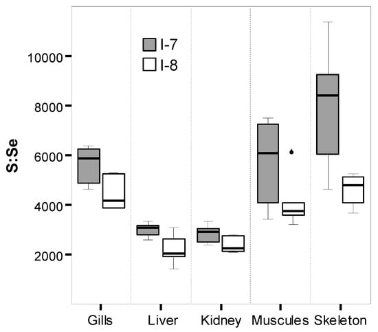 Molar relations of sulfur to selenium (S:Se) in whitefish organs and tissues from the thermal pollution area (I-7) and the natural habitat area (I-8).