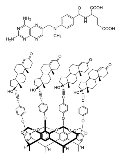 There is a wide range of literature available on the interactions between MTX and some macrocyclic compounds, e.g., cyclodextrins [12,13,14] and cucurbiturils [15], but just a limited number of researches were reported about the calixarene derivatives [16]. Moreover, no publication was found to describe the interaction of MTX with cavitands, despite that calixarenes and cavitands have some advantages compared with other host molecules, because they possess an aromatic cavity, which can embed MTX due to the π–π and CH–π interactions both inside and outside the cavity [16].