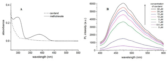 Absorption spectra of MTX (10 µM) and TAC (10 µM) (A) and fluorescence emission spectra of MTX (10 µM) in the absence and presence of TAC (0–30 µM) at 393.15 K (B) PL and a.u. reflect photoluminescence and arbitrary units, respectively.