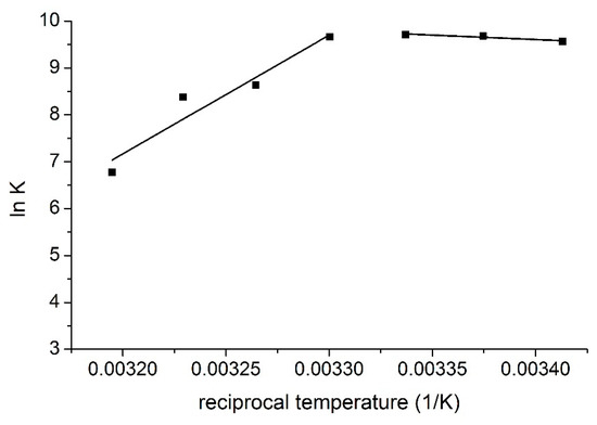 Two different temperature regions can be observed on the van ’t Hoff plot (the logarithms of the stability constants were plotted against the reciprocal temperatures, Figure 4) of the interaction where the thermodynamic parameters of the complex formation differ significantly.