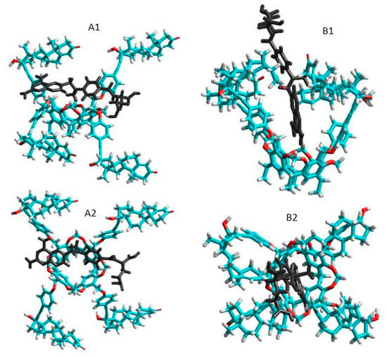 Side and top views of the equilibrium conformations of methotrexate–cavitand complexes associated with the opened (A1 and A2) and closed (B1 and B2) conformations of the cavitand (blue, red, white and black colors mean carbon, oxygen, hydrogen atoms and MTX molecule, respectively).