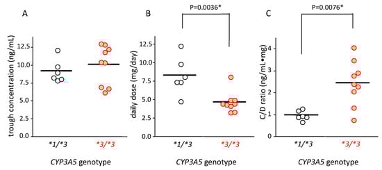 The tacrolimus blood concentrations (median (range)) in the CYP3A5*1 (active genotype, sum of *1/*1 and *1/*3, n = 6) and CYP3A5*3 (nonfunctional genotype, *3/*3, n = 4) were 9.3 (3.9–17.6) ng/mL and 9.9 (7.3–11.6) ng/mL, respectively (Figure 5A). The blood tacrolimus C/D ratio (median (range)) in patients carrying the CYP3A5*1 and CYP3A5*3 alleles was 0.96 (0.50–1.1) (ng/mL)/(mg/day) and 1.68 (0.98–2.04) (ng/mL)/(mg/day) (p = 0.0381), respectively (Figure 5B).