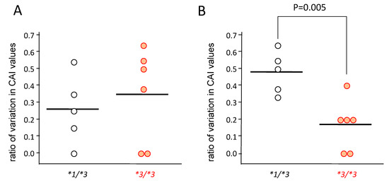 In patients carrying CYP3A5*1/*3 (n = 5), the CAI values decreased gradually from day 0 to day 30 (Figure 3A,C,E), but in patients carrying CYP3A5*3/*3 (n = 6), the CAI values rapidly decreased from day 0–14, and did not change much from day 14–30 (Figure 3B,D,F). Furthermore, although the rate of change was large in CYP3A5*3/*3 from day 0–14, significantly higher rates of change were seen in patients carrying CYP3A5*1/*3 from day 14–30 (p = 0.005) (Figure 4).