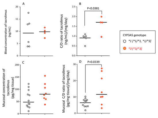 The mucosal C/D ratio of tacrolimus (median (range)) in patients with CYP3A5*1 and CYP3A5*3 allele was 7.0 (1.9–10.3) (ng/mL)/(mg/mL) and 11.5 (3.2–27.5) (ng/mL)/(mg/mL), respectively, with a significant difference between these values (p = 0.0339) (Figure 5D).