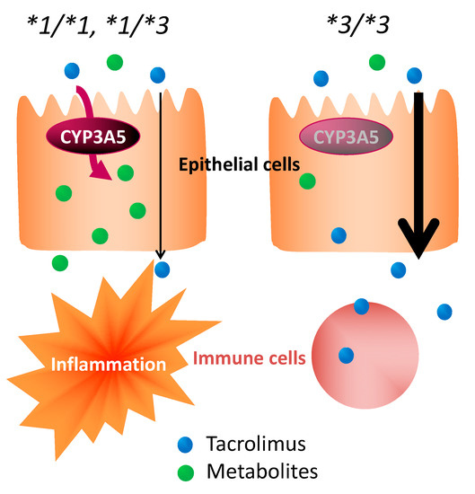 With no concomitant use of drugs potentially showing drug–drug interaction with tacrolimus in the present study, it was suggested that the effect of tacrolimus in the treatment of UC varied, depending on the polymorphism of CYP3A5 (Figure 3 and Figure 4). These results suggested that the time to evaluate tacrolimus treatment for UC should be optimized based on the CYP3A5 genotype. We hypothesized the following to explain these clinical results using molecular biology: The *1 or *3 genotypes reflect the activity or the nonfunctional of CYP3A5, respectively, which is a major enzyme of the CYP3A subfamily expressed in colon epithelial cells. Hence, orally administered tacrolimus would be extensively metabolized in the epithelial cells of the colon in patients carrying the CYP3A5*1 allele and, consequently, the immunocompetent cells would be deprived of the dose of tacrolimus required for optimal therapeutic effect (Figure 6). In contrast, a higher concentration of unmetabolized tacrolimus was found in the immune cells in the CYP3A5*3/*3 genotype. Therefore, the clinical evaluation of tacrolimus therapy in the management of UC requires more time in patients carrying the CYP3A5*1 allele than in those carrying the CYP3A5*3/*3. In fact, in the present study, there was an almost two-fold difference in the mucosal concentration of tacrolimus (Figure 5C) and its mucosal C/D ratio (Figure 5D) despite similar blood levels of tacrolimus among CYP3A5 genotypes (Figure 5). Furthermore, the patients in the CYP3A5*1 group tended to be more frequently prescribed biological products after tacrolimus therapy during the 30 months’ survey after the start of tacrolimus therapy (3 out of 5 in CYP3A5*1/*1, *1/*3 versus 1 out of 6 in CYP3A5*3/*3; odds ratio (OR) = 7.5; 95% CI = 0.5–122.8). These results support our hypothesis (Figure 6). Tacrolimus is also metabolized in the liver, but tacrolimus has a gastrointestinal absorption rate of about 20%. Furthermore, the area under the concentration-time curve (AUC) coefficient of variation for oral administration and continuous IV injection is 72% and 42%, respectively. Therefore, it is considered that about 40% of individual variation in blood concentration after oral administration occur during the absorption process from the digestive tract. The cytochrome P450 (CYP) content of the digestive tract is considered as 1/80 compared to that in liver, but tacrolimus has a high protein-binding rate and, therefore, the metabolic contribution in the digestive tract cannot be important [7]. In liver-transplant patients, the CYP3A5 genotype influences not only the tacrolimus-blood levels, but also the hepatic-drug levels, which may pose a potential risk of acute rejection after transplantation [36]. There are studies that report the efficacy of tacrolimus suppositories and enemas in UC [37]. Based on these backgrounds and present results, the CYP3A5 polymorphisms were suggested to act as an important role in the local mucosal concentration of tacrolimus as well as systemic blood level of tacrolimus mainly affected by hepatic metabolism. Therefore, it was thought that not only the blood concentration but also the concentration at the inflammatory area is important for the therapeutic effect of tacrolimus against UC. Furthermore, CYP3A4 and CYP3A5 have haplotypes, but the most common CYP3A5*3/*3 is in combination with CYP3A4*1 (wild type) [38], and the CYP3A5*1 is in combination with CYP3A4*1G [39]. Considering almost no expression level of CYP3A4 in colon mucosa, it is unlikely that CYP3A4 will affect the mucosal concentration of tacrolimus in patients with CYP3A5*3/*3. Further analysis may be needed to clarify the molecular mechanisms to affect mucosal concentration of tacrolimus in colon in addition to CYP3A5.