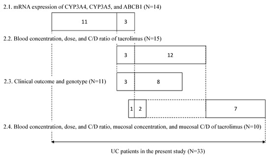 Between May 2010 and May 2015, patients participating in the retrospective study at Kyoto University Hospital (Kyoto, Japan) provided written informed consent. Patients aged 15 years or younger and those treated with topical formulations were excluded from the study; a total of 33 patients were included in the study. Each patient underwent periodic sigmoidoscopy, in which mucosal biopsy samples (about 1-mm-cube each) were collected from a couple of areas in the rectum. The endoscopy was not done just for this study, but for taking biopsy specimens for pathological examination. The samples were put in a microtube, immediately frozen in liquid nitrogen, and stored at −80 °C until analysis to determine the mRNA expression levels of CYP3A4, CYP3A5, and ABCB1, and/or the concentration of tacrolimus. In 14 patients, the mRNA expression levels of CYP3A4 and CYP3A5 in non-inflamed colonic or rectal mucosa and the mRNA expression levels of ABCB1 in non-inflamed and inflamed colonic or rectal mucosa were examined. The relationship between tacrolimus concentration/dose (C/D) ratio and CYP3A5 genotype in 15 patients treated with tacrolimus was examined. The relationship between the ratio of variation in CAI values and CYP3A5 genotype was examined in 11 patients. The relationship of the mucosal concentration/dose ratio of tacrolimus and CYP3A5 genotype was examined in 10 patients, on whom a biopsy was performed during tacrolimus therapy (Figure 7).