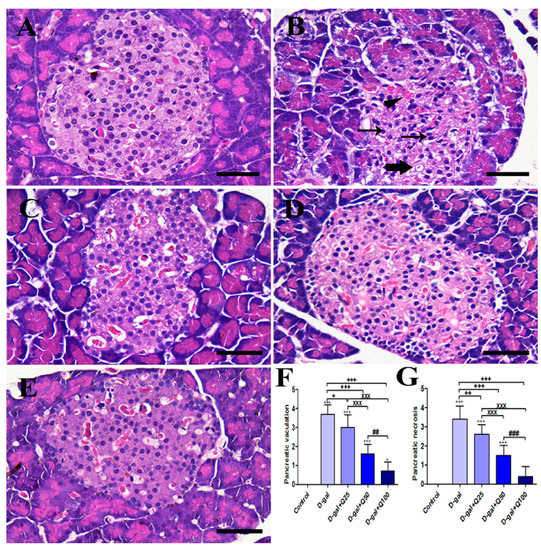 Figure 1. Histopathological examination of rats’ pancreas. (A) Negative control group. (B) D-gal group revealing pyknotic nuclei (thin arrows), congested blood vessels (arrowhead) and vacuolations in cells (thick arrow). (C) D-gal+Q25 group. (D) D-gal+Q50 group. (E) D-gal+Q100 group. (F) Hematoxylin and Eosin (H&E) semiquantitative scoring of pancreatic vacuolations. (G) H&E semiquantitative scoring of pancreatic necrosis. Scale bar = 50 µm. Data were analyzed with one-way ANOVA followed by Tukey’s multiple comparison test. * p < 0.05 and *** p < 0.001 vs. control. + p < 0.05, ++ p < 0.01, and +++ p < 0.001 vs. D-gal. xxx p < 0.001 vs. D-gal+Q25. ## p < 0.01 and ### p < 0.001 vs. D-gal+Q50. Error bars represent mean ± SD.