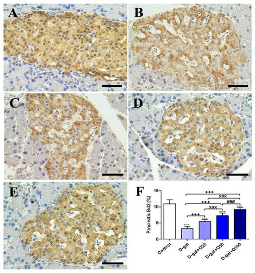 Figure 2. Immunohistochemical staining of rats’ pancreas with B-cell lymphoma 2 (Bcl2). (A) Negative control group. (B) D-gal group. (C) D-gal+Q25 group. (D) D-gal+Q50 group. (E) D-gal+Q100 group. (F) Quantification of Bcl2 in the pancreatic islets of Langerhans in different groups. Scale bar = 50 µm. Data were analyzed with one-way ANOVA followed by Tukey’s multiple comparison test. *** p < 0.001 vs. control. +++ p < 0.001 vs. D-gal. xxx p < 0.001 vs. D-gal+Q25. ### p < 0.001 vs. D-gal+Q50. Error bars represent mean ± SD.