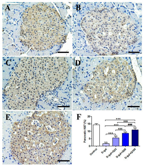 Figure 3. Immunohistochemical staining of rats’ pancreas with Ki67. (A) Negative control group. (B) D-gal group. (C) D-gal+Q25 group. (D) D-gal+Q50 group. (E) D-gal+Q100 group. (F) Quantification of Ki67 in pancreatic islets of Langerhans in different groups. Scale bar = 50 µm. Data were analyzed with one-way ANOVA followed by Tukey’s multiple comparison test. *** p < 0.001 vs. control. +++ p < 0.001 vs. D-gal. xxx p < 0.001 vs. D-gal+Q25. ### p < 0.001 vs. D-gal+Q50. Error bars represent mean ± SD.