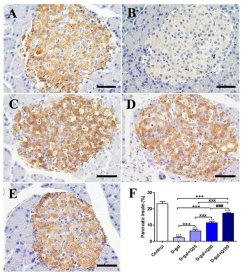Figure 4. Immunohistochemical staining of rats’ pancreas with insulin. (A) Negative control group. (B) D-gal group. (C) D-gal+Q25 group. (D) D-gal+Q50 group. (E) D-gal+Q100 group. (F) Quantification of insulin in pancreatic islets of Langerhans in different groups. Scale bar = 50 µm. Data were analyzed with one-way ANOVA followed by Tukey’s multiple comparison test. *** p < 0.001 vs. control. +++ p < 0.001 vs. D-gal. xxx p < 0.001 vs. D-gal+Q25. ### p < 0.001 vs. D-gal+Q50. Error bars represent mean ± SD.