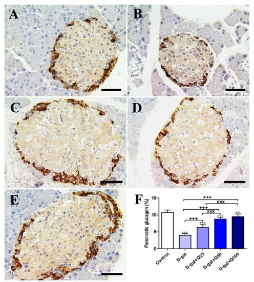 Figure 5. Immunohistochemical staining of rats’ pancreas with glucagon. (A) Negative control group. (B) D-gal group. (C) D-gal+Q25 group. (D) D-gal+Q50 group. (E) D-gal+Q100 group. (F) Quantification of glucagon in pancreatic islets of Langerhans in different groups. Scale bar = 50 µm. Data were analyzed with one-way ANOVA followed by Tukey’s multiple comparison test. ** p < 0.01 and *** p < 0.001 vs. control. +++ p < 0.001 vs. D-gal. xxx p < 0.001 vs. D-gal+Q25. Error bars represent mean ± SD.