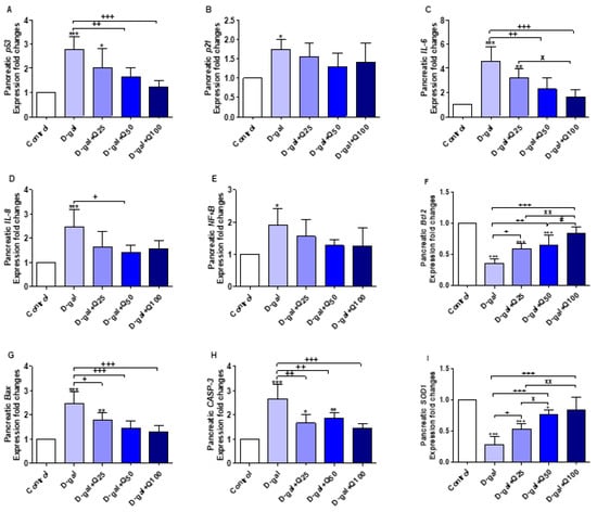 Figure 6. Expression of fold changes of pancreatic (A) p53, (B) p21, (C) interleukin-6 (IL-6), (D) interleukin-8 (IL-8), (E) nuclear factor-kappa B (NF-κB), (F) B-cell lymphoma 2 (Bcl2), (G) Bcl-2-associated X protein (Bax), (H) caspase-3 (CASP-3), and (I) Cu, Zn-superoxide dismutase (SOD1) mRNA levels: Data were analyzed with one-way ANOVA followed by Tukey’s multiple comparison test. * p < 0.05, ** p < 0.01, and *** p < 0.001 vs. control. + p < 0.05, ++ p < 0.01, and +++ p < 0.001 vs. D-gal. x p < 0.05 and xx p < 0.01 vs. D-gal+Q25. # p < 0.05 vs. D-gal+Q50. Error bars represent mean ± SD. n = 5.
