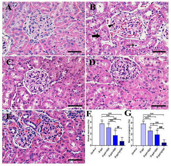 Figure 7. Histopathological examination of rats’ kidney. (A) Negative control group. (B) D-gal group revealing congestion (arrowhead), degeneration in the renal tubules (thin arrow), and intratubular eosinophilic proteinaceous materials inside the lumen of renal tubules (thick arrow). (C) Gal-Q25 group. (D) D-gal+Q50 group. (E) D-gal+Q100 group. (F) H&E semiquantitative scoring of renal necrosis. (G) H&E semiquantitative scoring of renal congestion. Scale bar = 50 µm. Data were analyzed with one-way ANOVA followed by Tukey’s multiple comparison test. Error bars represent mean ± SD. *** p < 0.001 vs. control. +++ p < 0.001 vs. D-gal. x p < 0.05 and xxx p < 0.001 vs. D-gal+Q25. ## p < 0.01 and ### p < 0.001 vs. D-gal+Q50.