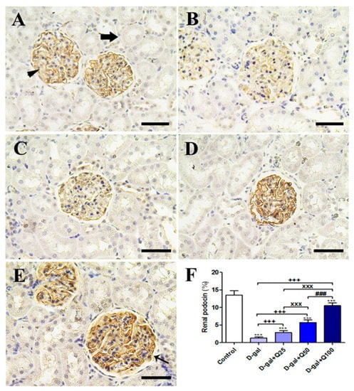 Figure 8. Immunohistochemical staining of rats’ kidney with podocin. (A) Negative control group showing high reaction in the renal glomerulus (arrowhead) and no reaction in the renal tubule (arrow). (B) D-gal group revealing weak podocin reaction. (C) D-gal+Q25 group. (D) D-gal+Q50 group. (E) D-gal+Q100 group. (F) Quantification of podocin in the renal tissues in different groups. Scale bar = 50 µm. Data were analyzed with one-way ANOVA followed by Tukey’s multiple comparison test. Error bars represent mean ± SD. *** p < 0.001 vs. control. +++ p < 0.001 vs. D-gal. xxx p < 0.001 vs. D-gal+Q25. ### p < 0.001 vs. D-gal+Q50.
