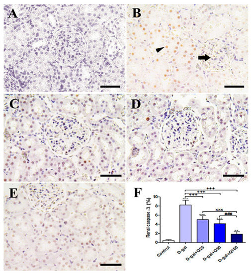 Figure 9. Immunohistochemical staining of rats’ kidney with caspase-3. (A) Negative control group. (B) The D-gal group revealing a strong caspase-3 reaction in the renal tubule (arrowhead) and the renal glomerulus has negative reactions (arrow). (C) D-gal+Q25 group. (D) D-gal+Q50 group. (E) D-gal+Q100 group. (F) Quantification of caspase-3 in the renal tissues in different groups. Scale bar = 50 µm. Data were analyzed with one-way ANOVA followed by Tukey’s multiple comparison test. Error bars represent mean ± SD. ** p < 0.01 and *** p < 0.001 vs. control. +++ p < 0.001 vs. D-gal. xxx p < 0.001 vs. D-gal+Q25. ### p < 0.001 vs. D-gal+Q50.