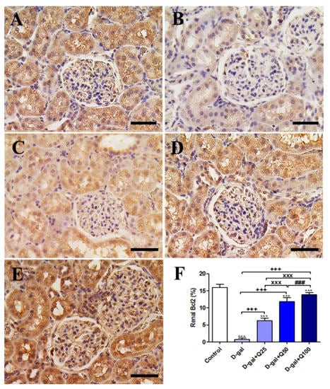 Figure 10. Immunohistochemical staining of rats’ kidney with B-cell lymphoma 2 (Bcl2). (A) Negative control group. (B) D-gal group. (C) D-gal+Q25 group. (D) D-gal+Q50 group. (E) D-gal+Q100 group. (F) Quantification of Bcl2 in the renal tissues in different groups. Scale bar = 50 µm. Data were analyzed with one-way ANOVA followed by Tukey’s multiple comparison test. *** p < 0.001 vs. control. +++ p < 0.001 vs. D-gal. xxx p < 0.001 vs. D-gal+Q25. ### p < 0.001 vs. D-gal+Q50. Error bars represent mean ± SD.