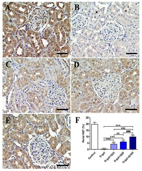 Figure 11. Immunohistochemical staining of rats’ kidney with Ki67. (A) Negative control group. (B) D-gal group. (C) D-gal+Q25 group. (D) D-gal+Q50 group. (E) D-gal+Q100 group. (F) Quantification of Ki67 in the renal tissues in different groups. Scale bar = 50 µm. Data were analyzed with one-way ANOVA followed by Tukey’s multiple comparison test. *** p < 0.001 vs. control. +++ p < 0.001 vs. D-gal. xx p < 0.01 and xxx p < 0.001 vs. D-gal+Q25. ### p < 0.001 vs. D-gal+Q50. Error bars represent mean ± SD.