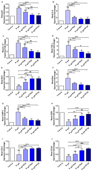 Figure 12. Expression of fold changes of renal (A) p21, (B) interleukin-6 (IL-6), (C) interleukin-1beta (IL-1β), (D) tumor necrosis factor-alpha (TNF-α), (E) B-cell lymphoma 2 (Bcl2), (F) Bcl-2-associated X protein (Bax), (G) caspase-3 (CASP-3), (H) Cu, Zn-superoxide dismutase (SOD1), (I) glutamate-cysteine ligase catalytic subunit (GCLC), and (J) glutamate-cysteine ligase regulatory subunit (GCLM) mRNA levels: Data were analyzed with one-way ANOVA followed by Tukey’s multiple comparison test. * p < 0.05, ** p < 0.01, and *** p < 0.001 vs. control. + p < 0.05, ++ p < 0.01, and +++ p < 0.001 vs. D-gal. x p < 0.05, xx p < 0.01, and xxx p < 0.001 vs. D-gal+Q25. Error bars represent mean ± SD. n = 5.