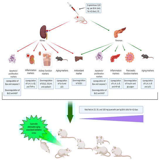 The oxidative stress hypothesis remains possibly the basis of aging-associated cellular alterations. Quercetin in a dose-dependent manner potentially attenuated the oxidative stress induced by D-gal in the pancreatic and renal tissues of rats through the upregulation of antioxidant (SOD1), antiapoptotic (Bcl2), and functional markers. Also, quercetin downregulated aging (p53, p21, IL-6, and IL-8), apoptotic (Bax and CASP-3), and inflammatory (NF-κB, IL-1β, and TNF-α) markers. Our results suggest that quercetin successfully alleviated aging of rats’ pancreatic and renal tissues, thus rendering quercetin to be a promising natural antiaging compound.