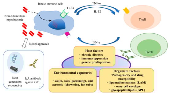 Non-tuberculous mycobacteria (NTM) are ubiquitous environmental organisms of considerable clinical relevance, which are commonly found in water and soil [1]. Population-based data show that the incidence of NTM infections is increasing worldwide, notably, NTM infections have surpassed Mycobacterium tuberculosis (Mtb) infections in developed countries [2]. NTM infections occur in lymph nodes, skin and soft tissues, lung, and systemically (i.e., disseminated infection). Despite the ubiquitous presence of NTM species in the environment and presumably pervasive human exposure, the occurrence of NTM-related diseases is relatively infrequent [3]. This discrepancy suggests that NTM species possess low to moderate pathogenicity, such that host risk factors may play integral roles in vulnerability to NTM infections. Thus, individuals with abnormal immune systems exhibit an elevated risk of NTM infection; because of its chronic nature, NTM infection constitutes a significant health burden on various populations and is an important cause of morbidity and mortality [4,5]. As shown in Figure 1, environmental exposures, host factors, and organismal factors contribute to development and progression of NTM infection. Innate immune responses play crucial roles in recognizing and eliminating these pathogens. Furthermore, cytokine networks (e.g., tumor necrosis factor-α, interleukin [IL]-12, and interferon [IFN]-γ) play essential roles in regulating and bridging innate and adaptive immune responses through the induction and resolution of inflammation.