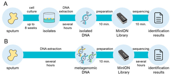 From a clinical perspective, the mycobacterial incubation time is a bottleneck in the overall diagnostic process, because up to 8 weeks of growth may be needed to obtain culture isolates of slow-growing species. With the MLST approach using comprehensive genomic information regarding mycobacteria, the Oxford Nanopore Technologies MinION sequencer enables diagnosis within 20 min from isolated genomic DNA with mlstverse [96] (Figure 2). In addition, NGS technologies may allow direct detection of pathogens from metagenomic DNA because they present sequencing results in real-time. A recent study proposed a direct Mtb detection method using MinION [97]. Further comprehensive and highly sensitive identification methods to discriminate mycobacteria are necessary because NTM species should be distinguished from Mtb. Accurate and rapid identification of the entire Mycobacteriaceae family may become possible with the use of NGS (Figure 2). This whole-genomic approach will facilitate appropriate treatment plans for NTM infection with reductions in mycobacteria-related deaths worldwide.