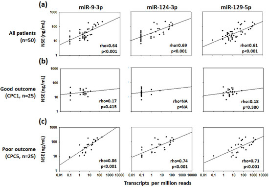 Correlations between miRNAs and neuron-specific enolase (NSE). Scatter plot and linear regression lines show the correlation between NSE and levels of miR9-3p, miR124-3p, and miR129-5p, (a) measured 48 h after ROSC in 50 patients, (b) 25 patients with good neurological outcome (CPC 1) and (c) 25 patients with poor neurological outcome or died (CPC 5) at 6 months after cardiac arrest. Spearman correlation coefficients (rho) and p-values are indicated. NA = Not applicable as only few patients have miRNA values above the level of detection.