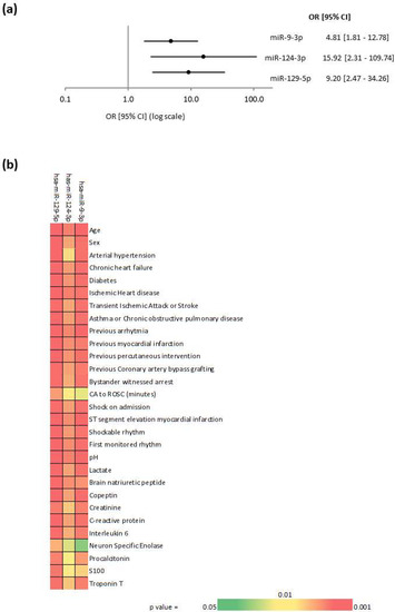 Association between miRNAs and neurological outcome. The association between levels of miR9-3p, miR124-3p and miR129-5p measured 48 h after ROSC in 50 patients and neurological outcome as attested by CPC score (1 vs. 5) at 6 months after cardiac arrest was addressed using univariate and multivariate logistic regression. (a) Forest plot with univariate odds ratios (OR) ± 95% confidence intervals (CI) for the prediction of neurological outcome. (b) Heat-map representing the statistical significance of multivariate logistic regression models containing one miRNA and one demographic or clinical variable. The coloured scale is as follows: p = 0.001 (red) and p = 0.05 (green), p = 0.01 being used as a middle point for the colour gradient. All values represented had a p-value below 0.05, and p-values below 0.001 were displayed as the maximum intensity of red.