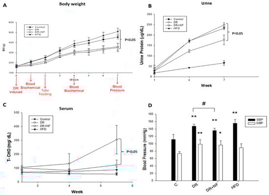 Figure 1. Changes in body weight (BW), urine protein and serum cholesterol levels, and blood pressure (BP) in rats. (n = 3 for each group) (A) At week 7, the bodyweight of the high-fat diet (HFD) group was higher than that of the DR+NF group (500 vs. 320 g; p < 0.05). (B) The DR+NF group had a higher urine protein level than the DR group (p < 0.05) at week 7. (C) The DR+NF group had higher serum total cholesterol than the DR group (p < 0.05) at week 7. (D) DR+NF, DR, and HFD groups had higher systolic pressure (** p < 0.05) compared to the control group. DR+NF and DR groups showed higher diastolic pressure than the control (** p < 0.05 and * p < 0.1, respectively). The DR+NF group had lower BP compared to the DR group. (# p < 0.05).