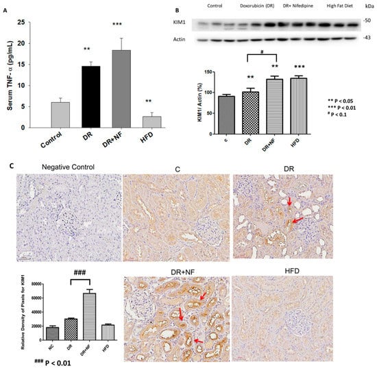 Figure 2. Tumor necrosis factor-α (TNF-α) and kidney injury molecular-1 (KIM-1) shown in the blood sampling and renal tissue of rats. (n = 3 for each group) (A) ELISA showed that serum TNF-α levels in the DR and DR+NF groups were significantly higher than in the control group (2.46- and 3.08-fold, ** p < 0.05 and *** p < 0.01, respectively), but the high-fat diet (HFD) group had lower TNF-α levels compared to the control (0.54-fold, ** p < 0.05), (B) Representative western blotting and quantification of KIM-1 (actin as an internal control ) in renal tissues showed that the KIM-1 of the DR+NF, DR, and HFD group were higher than that in the control group (** p < 0.05); besides, the DR+NF group had higher KIM-1 expression than the DR group (1.33-fold, ** p < 0.05). (C) Immunohistochemical staining and quantification of the image showed a higher intensity of KIM-1 in the renal tubules of the DR and DR+NF group (*** p < 0.01). Nifedipine causes much stronger staining of KIM-1 in the DR+NF rats compared to the DR-only group (magnification is 200 ×, ### p < 0.01).