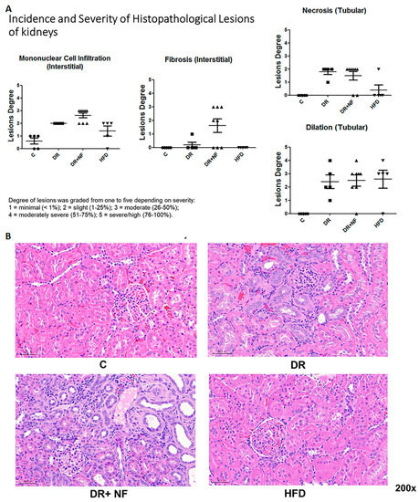 As shown in Figure 3, hematoxylin and eosin (H+E) staining of the renal tissues showed that the DR group had more severe pathological damage compared to the control, as demonstrated by the increased mononuclear cell infiltration, fibrosis, necrosis, and tubular dilatation. The severity was even greater in the DR+NF group (Figure 3A). Although the HFD group also exhibited high levels of mononuclear cell infiltration, necrosis, and dilatation, fibrosis was not apparent in this group. In summary, tubular dilation and mononuclear cell infiltration were observed in all experimental groups but not in the control. However, the DR+NF group exhibited the most dominant interstitial fibrosis, accounting for up to 25% of the lesion degree = 2 (1–25%).