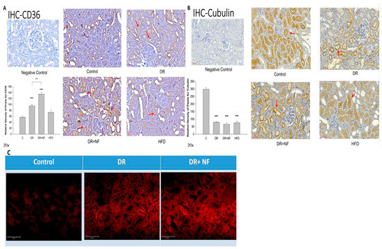 IHC staining of the kidney indicated that peri-tubular membrane CD36 expression was high in the DR groups (Figure 4A); however, expression was further increased in the DR+NF group compared with that in the DR group (p < 0.01). Cubilin expression was lower in the DR, DR+NF, and HFD groups than in the control group (p < 0.01). Additionally, NF did not cause a further reduction in the cubilin level (Figure 4B). Nile red staining revealed the deposition of more lipid droplets in the DR and DR+NF groups (Figure 4C).