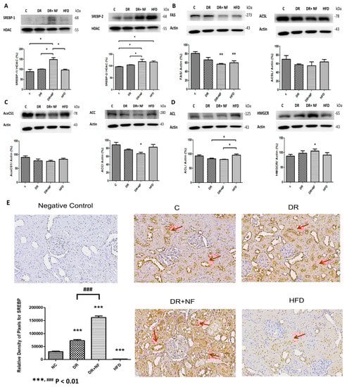 Figure 5. Sterol regulatory element-binding protein (SREBP)-1/2 transcriptional factor and related enzymes in rats. (n = 3) (A) In renal tissue, western blotting showed that SREBP-1/2 was significantly increased in the DR+NF group compared to the DR group and the control (* p < 0.05). (B) Fatty acid synthase (FAS) (actin as control) showed lower expression in the DR, DR+NF, and HFD groups compared to the control group (** p < 0.01). (C) Acetyl-CoA carboxylase (ACC) (actin as control) was decreased in the DR+NF group compared to the control (* p < 0.05). (D) The HFD group showed considerably higher ACL expression compared to the control group, and the expression of HMGCR was also significant in the DR+NF group relative to the control (* p < 0.05). (E) The immunohistochemical expression and quantification of SREBP (red arrow) in the rat renal tubule was increased significantly in the DR and DR+NF groups compared to the control. DR+NF was more prominently enhanced than DR only (### p < 0.01, *** p < 0.01). However, expression of SREBP was decreased in the HFD group (magnification 200×).