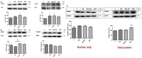 Figure 6. The western blot expression of 5′Adenosine monophosphate-activated protein (AMPK) and peroxisome proliferator-activated receptor 1-α (PPAR-α) in rats. (n = 3) (A) In renal tissue, phospho-acetyl-CoA carboxylase (P-ACC)/ACC was increased in the DR and DR+NF groups (148% and 150%, respectively, * p < 0.05). (B) AMPK expression (actin as control) in the DR+NF group was increased relative to the DR group (# p < 0.05), whereas phospho-AMPK/AMPK was decreased in DR+NF compared with the control group (# p < 0.05). (C) Nuclear PPAR-α protein expression levels were similar (HDAC as the internal control). However, total PPAR-α protein was increased by up to 130% in the HFD group compared to the control (actin as control) (*** p < 0.05).