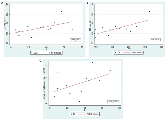 Figure 7. Low-density lipoprotein (LDL) levels and graft kidney lipid accumulation/fibrosis in patients who received kidney transplantation. (n = 18) (A) Serum LDL significantly, positively correlated with fibrosis in the graft kidneys, as shown by E (kidney stiffness) (r = 0.64, p = 0.02). (B) Serum LDL significantly, positively correlated with lipid accumulation in the graft kidneys. The controlled attenuation parameter (CAP) (r = 0.06, p = 0.05) is shown. (C) Serum creatinine (Cr, mg/dL) positively correlated with fibrosis in graft kidneys, as shown by E (r = 0.54, p = 0.06).
