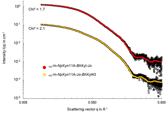 Superimposition of SAXS data from His-In-NpXyn11A-BhXyl43-Jo and His-In-NpXyn11A-Jo-BhXyl43 constructs and their structural models calculated with SASREFMX (red and orange line respectively). The data are presented as a plot of Log I(q) in cm−1 vs. Log q in Å−1 to magnify the region of small angles.