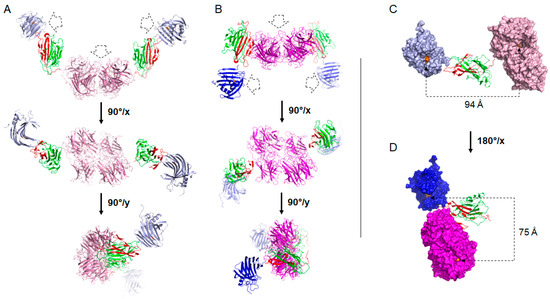 Regarding the chimeric complexes, Figure 2 displays the superimposition of the SAXS curves. The most important differences are observed at intermediate angles (0.01–0.07 Å−1) and the calculation of the autocorrelation function clearly shows that the two constructs adopt different conformations in solution. According to biophysical parameters such as Rg, Dmax, Porod’s volume and molecular weight (Table S1, His-In-NpXyn11A-Jo-BhXyl43 form appears more extended than the His-In-NpXyn11A-BhXyl43-Jo form with bigger Rg and Dmax values (Rg: 56.4 > 50.5 Å and Dmax 230 > 200 Å, respectively). On the other hand, the p(r) function of the His-In-NpXyn11A-Jo-BhXyl43 form presents two distinct modulations correlated with the presence of two separated domains, not clearly visible on the p(r) of His-In-NpXyn11A-BhXyl43-Jo form.