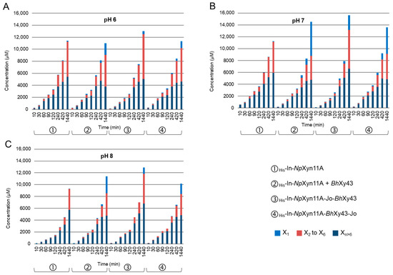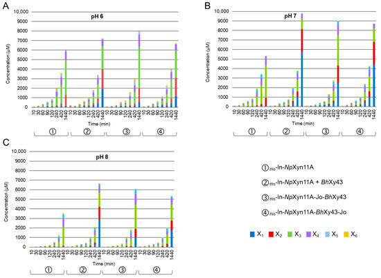 Total reducing end sugars were measured by DNSA, resulting in a concentration of equivalent xylose units expressed in µM. From these values, Figure 6 represents the total amount of xylose units, including the concentration of X1 and the sum of xylooligosaccharides from X2 to X6 as measured by HPAEC-PAD. The difference consists of polymers with a degree of polymerisation (DP) > 6. Regarding the total amount of reducing end sugars after 24 h, the chimeric enzyme His-In-NpXyn11A-Jo-BhXyl43 was the most productive compared to the other enzymes, whatever the pH. At neutral pH after 24 h, His-In-NpXyn11A released 11,279 µM of equivalent xylose, compared to 14,549 µM when the reaction medium was supplemented with His-BhXyl43, 13,596 µM with His-In-NpXyn11A-BhXyl43-Jo, and 15,640 µM with His-In-NpXyn11A-Jo-BhXyl43 (Figure 6B). Considering the effect of the xylanase activity only with respect to the corresponding concentration of equivalent amount of reduced xylose of oligomers of DP > 6 (lower DP may be provided by xylosidase activity), the complex His-In-NpXyn11A-Jo-BhXyl43 was the most active, with 6623 µM of equivalent xylose at pH 7, whereas His-In-NpXyn11A released 5933 µM, His-In-NpXyn11A + His-BhXyl43 4757 µM, and His-In-NpXyn11A-BhXyl43-Jo 4858 µM.