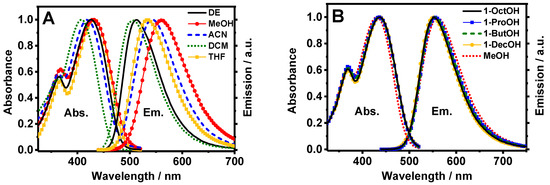 Normalized UV-visible absorption and fluorescence spectra of dimethyl 4-amino-8-cyanonaphthalene-2,6-dicarboxylate (Me2CANADC) linker in (A) dichloromethane (DCM) (green short dot), acetonitrile (ACN) (blue short dashes), diethyl ether (DE, black solid line), methanol (MeOH, red full circles), tetrahydrofuran (THF, orange full squares) and in (B) MeOH (red short dots), 1-propanol (1-ProOH, blue full squares), 1-butanol (1-ButOH, green short dashes), 1-octanol (1-OctOH, black solid line), and 1-decanol (1-DecOH, orange full circles). The excitation wavelength for the fluorescence spectra was 425 nm.