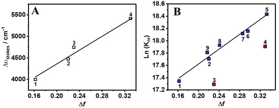 (A) Lippert–Mataga plot showing the dependence between the Stokes shift () and solvent orientation polarizability (∆f), and (B) show the dependence of Ln(knr) with ∆f of all the solvents except DCM (3) and ACN (4), which are shown as red squares. The labeling of the solvent is shown in Table 1. Graph (A) was lineally fitted to y = 8397x + 2683, with R2 = 0.97, n = 4, S.D. slope = 907 and S.D. (intercept) = 220. Graph (B) was lineally fitted to y = 6.01x + 16.4, with R2 = 0.97, n = 7, S.D. slope = 0.40 and S.D. (intercept) = 0.10.
