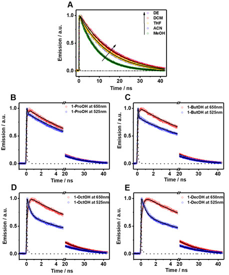 The picosecond–nanosecond (ps-ns) fluorescence decays of Me2CANADC in the used solvents were obtained by exciting the sample at 390 nm and gating at different wavelengths ranging between 500 and 650 nm. To make the analysis of the result easier, the fluorescence decays were separated into the observed in non-protic (but including methanol) and protic solvents. The fluorescence decays using the first solvents series could be fitted by a global monoexponential function all over the spectral range (Figure 3A and Table 1), whereas the fluorescence decays using the second solvents family exhibit a more complex behavior, and a multiexponential global analysis is required to get accurate fits (Figure 3B–E and Table 2). The monoexponential analyses provided emission lifetime values of 17.6, 17.3, 14.7, 14.2 and 8.9 ns in DE, DCM, THF, ACN, and MeOH, respectively (Table 1). The radiative and non-radiative constants (kr and knr) were calculated and are depicted in Table 1. As we previously mentioned, the increase in the polarity function of the solvent causes a decrease of the fluorescence quantum yield of Me2CANADC (with the exception of DCM), and the same effect was also observed for the emission lifetimes. Therefore, as the solvent becomes more polar, the non-radiative constant increases. We observed a very good correlation (R2 = 0.97) between the knr and the solvent orientation polarizability (∆f) taking out DCM and ACN solvents, as shown in Figure 2B.