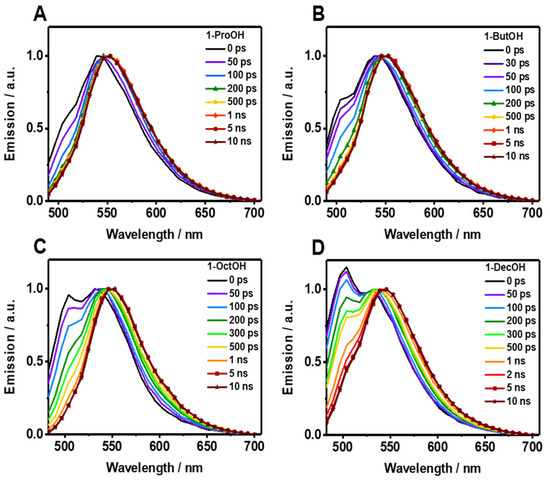 Picosecond time-resolved emission spectra (TRES) of Me2CANADC in (A) 1-ProOH, (B) 1-ButOH, (C) 1-OctOH, and (D) 1-DeOH at different delays as indicated in the inset. The spectra were normalized on the 550 nm band.