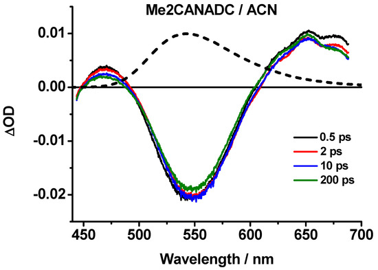 Femtosecond transient absorption spectra (TAS) of Me2CANADC in ACN solvent at different time delays upon excitation at 420 nm. The dashed spectrum corresponds to the steady-state emission one showing the good overlap with the negative TAS band.