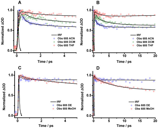 Femtosecond transient absorption decays of Me2CANADC in (A,B) ACN, DCM and THF and (C,D) DE and MeOH at different time windows. The solid lines are from the best multiexponential fits (see Table 3). The decays were recorded at 685 nm, and the samples were excited at 420 nm.