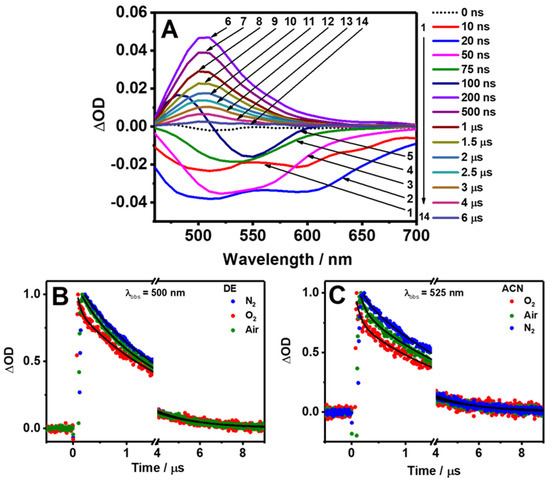 (A) Time-resolved transient absorption spectra of Me2CANADC in DE at different delay times upon excitation at 420 nm. (B,C) Transient decays of Me2CANADC in DE and ACN under different atmospheric conditions: air (green), oxygen (red), and nitrogen (blue). The observation wavelengths are indicated in the figure. The solid black lines are obtained from the best fit using a mono or multiexponential functions.