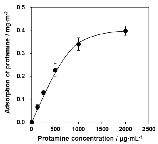 To prepare the protamine/HAp powders, HAp powders were mixed with various concentrations of a protamine solution for 48 h and were adsorbed by the batch method. The protamine adsorption to HAp powders increased with increasing the concentration of protamine in a dose-dependent manner (Figure 1) and reached saturation at over 1000 μg·mL−1 protamine. The adsorption of protamine to HAp followed the Langmuir adsorption isotherm.